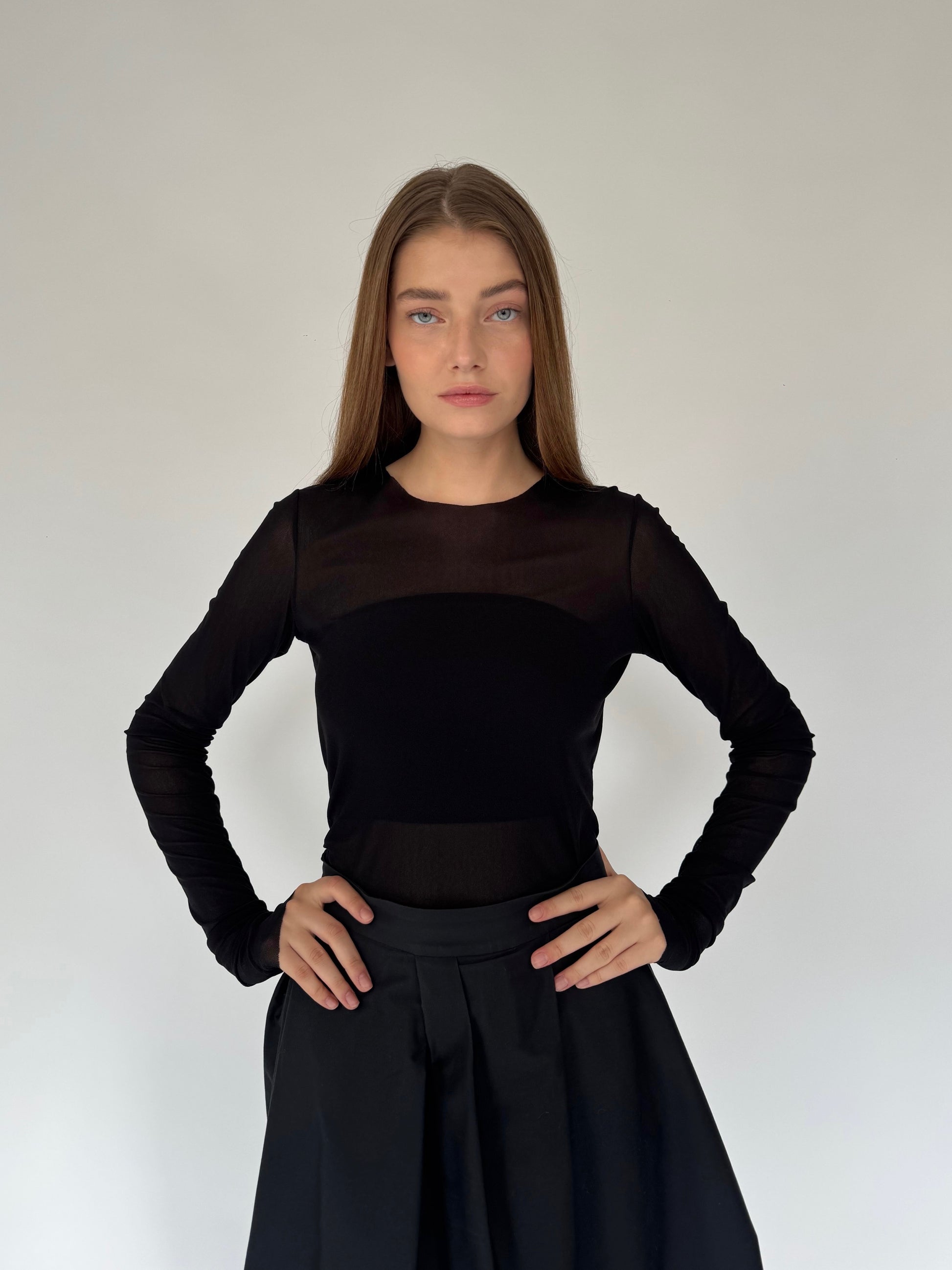 Juoda permatomo audinio palaidinė su prailgintomis rankovėmis